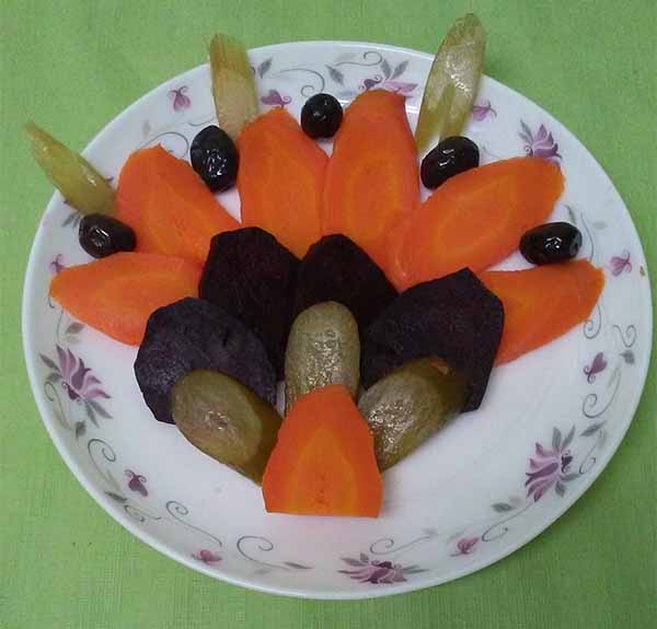 - Разложить красиво на тарелке, украсив соленым огурцом и маслинами.