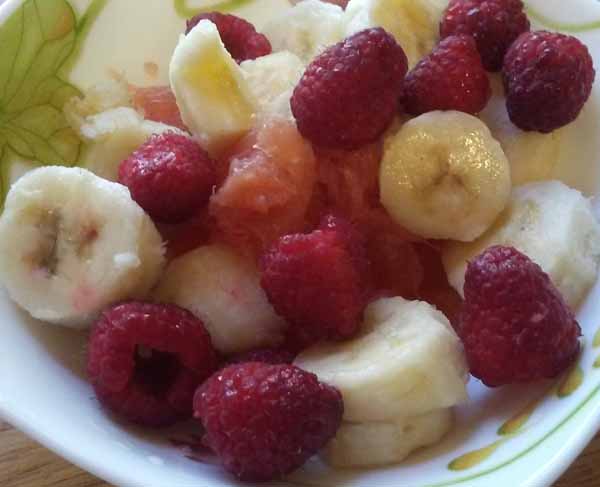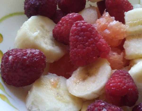 Фруктовый салат из малины, банана и грейпфрута Постная трапеза – это здоровье! Ингредиенты: – малина; – банан; – грейфрут; Приготовление. Вымыть фрукты и ягоды. Очистить от кожуры банан и грейпфрут. Нарезать ломтиками и смешать. Советуем. Подавать в качестве отдельного блюда или на десерт.