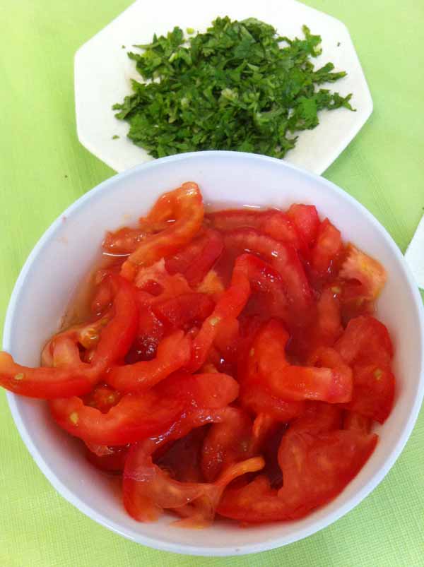 3. Помидоры ошпарить кипятком, снять кожицу и порезать ломтиками;
