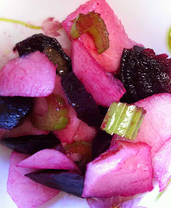 Салат из отварной свеклы, моркови, соленого огурца и сельдерея