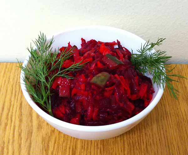Салат из отварной свеклы, моркови, соленого огурца и сельдерея