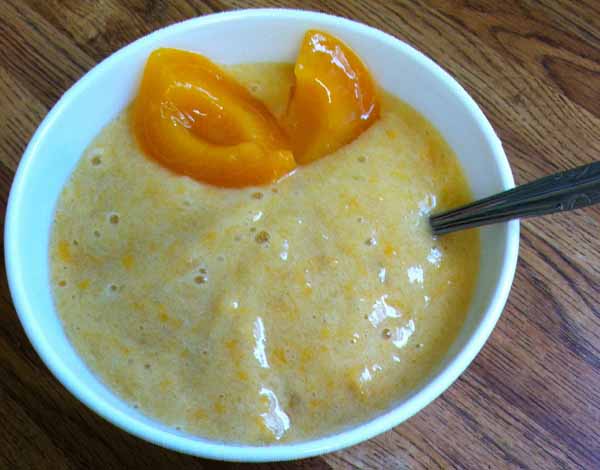 - Банан нарезать кусочками, добавить измельченные персики и взбить в блендере.