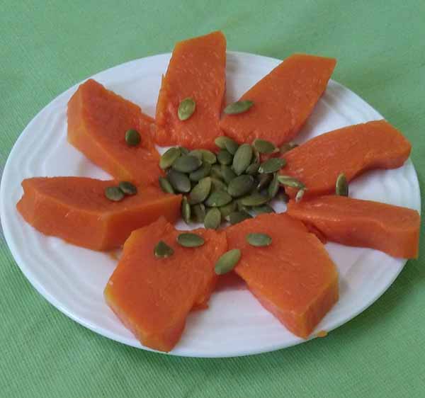 4. Готовую тыкву разложить на тарелку и сбрызнуть лимонным соком. Если тыква не сладкая – ешьте с медом.
