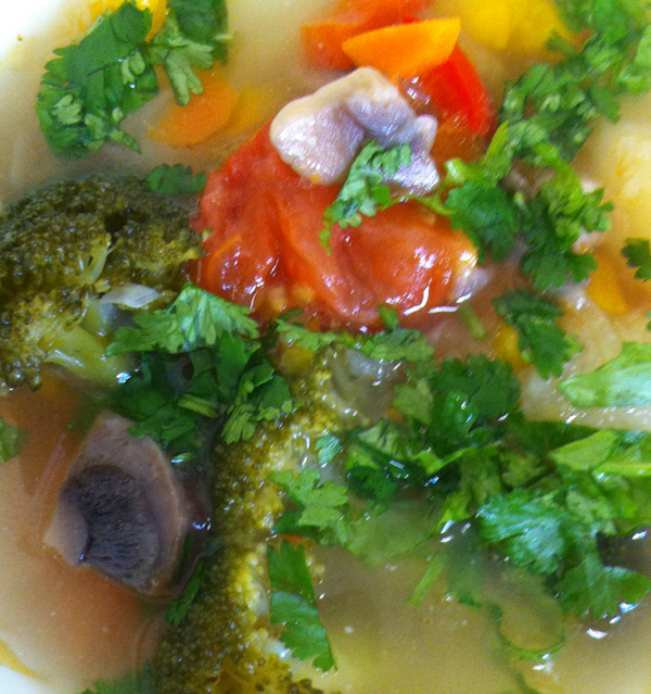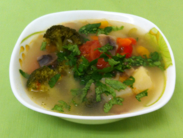 - За 5 минут до готовности, положить брокколи и помидор, посолить и добавить лавровый лист.