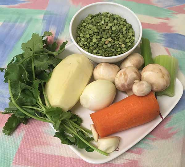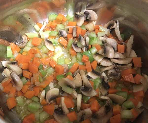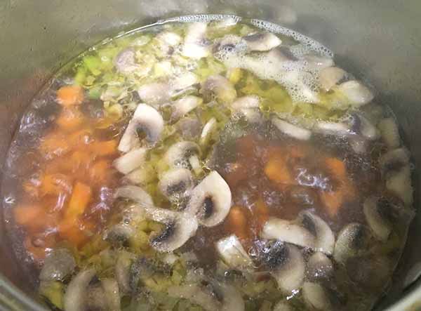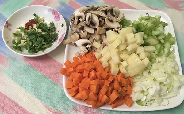 1. Почистить и нарезать грибы с овощами. Грибы – ломтиками, болгарский перец, сельдерей и морковь – мелкими кусочками, лук – полукольцами, капусту – нашинковать.