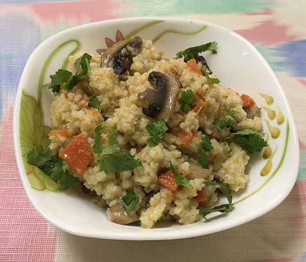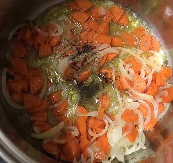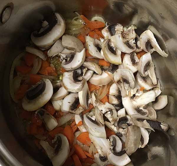 2. В разогретое растительное масло положить лук довести до розового цвета. Затем добавить грибы, перец, морковь.