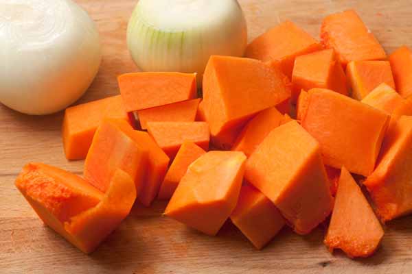 1. Тыкву и лук почистить. Нарезать мелкими кубиками.
