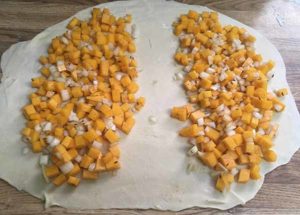 Тесто раскатать с тонкий пласт и выложить готовую начинку из тыквы. При желании, для сочности, добавить мелко нарезанную думбу или сливочное масло.