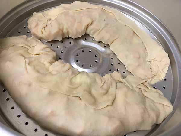 Скатать пласт рулетом и выложить на смазанную маслом решетку мантышницы (пароварки).