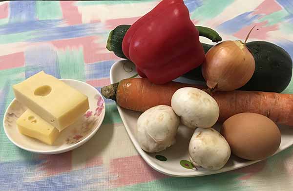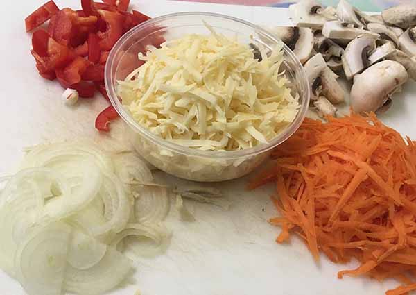 2. Грибы нарезать ломтиками, лук – полукольцами, болгарский перец – кусочками, морковь и сыр натереть на крупной терке.