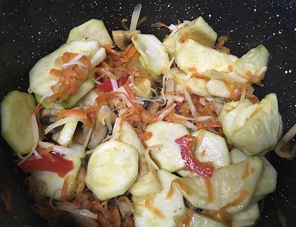 7. Добавить кабачки и 1/3 натертого сыра. Перемешать.