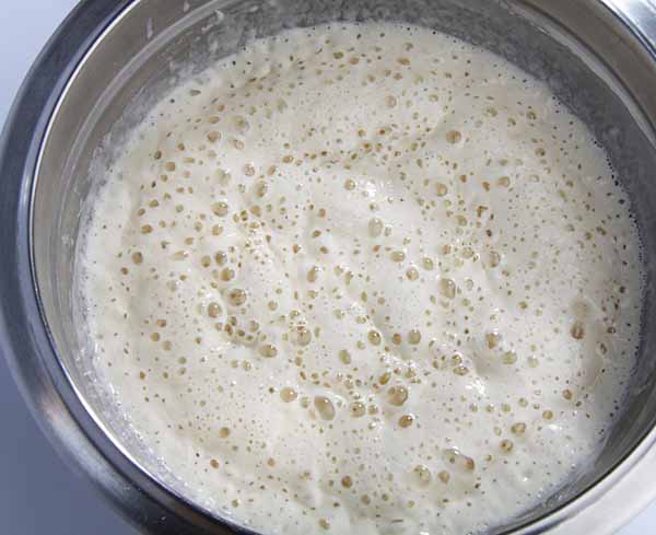 2. Оставить в теплом месте на 10-15 минут. Если дрожжи хорошие – опара увеличится в объеме и запузырится.