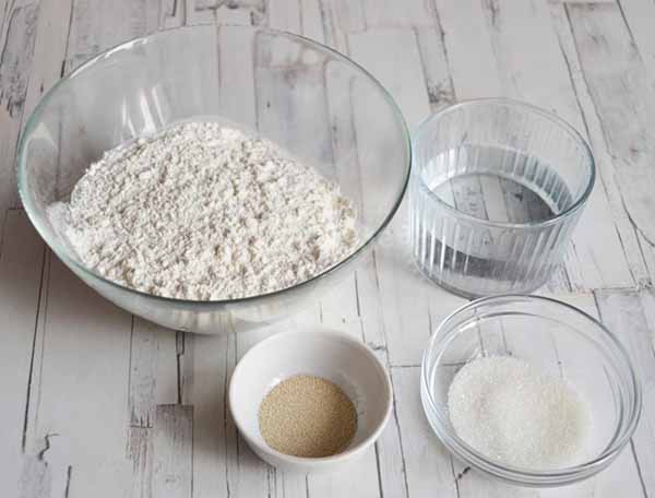 вода, мука, дрожжи, соль, масло– вода теплая, кипяченая – 1 стакан, 200 грамм;