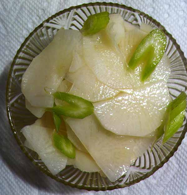 Закуска из дайкона с сельдереем Дайкон вымыть, почистить, нарезать тонкими ломтиками и залить холодной водой на 10-15 минут.